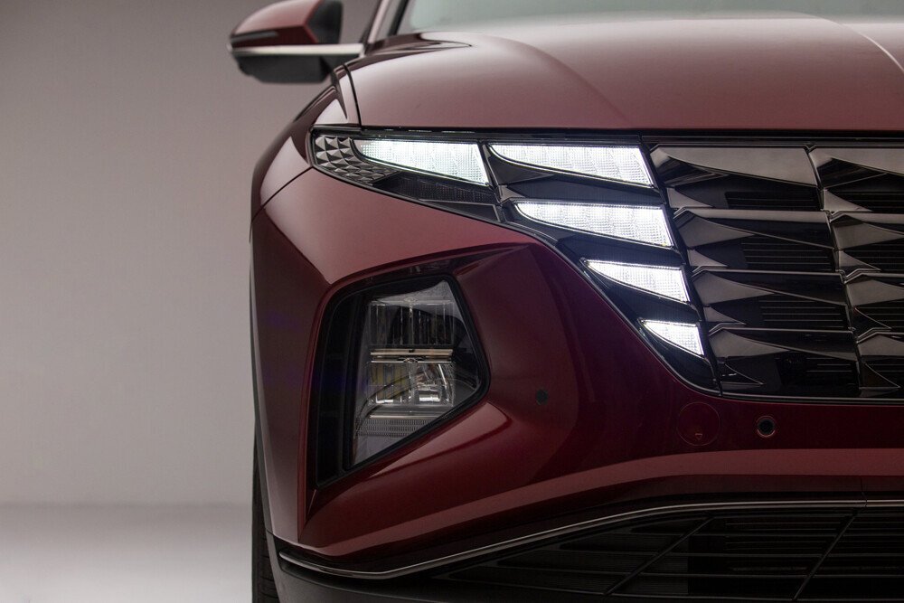 Ở phần đầu xe, điểm nhấn nổi bật chính là trang bị đèn ban ngày được thiết kế ẩn vào lưới tản nhiệt mang tên Parametric Jewel Hidden Lights. Khi xe tắt máy, mặt trước của xe dường như chỉ được bao phủ bằng các họa tiết hình học tối màu và sẽ trở nên nổi bật đầy ấn tượng khi xe lăn bánh trên đường. Hyundai Tucson cũng được trang bị đèn chiếu sáng full LED.